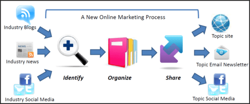 Selon Wikipedia ( je laisse le mot en anglais, car un des accords de la discussion twitter était qu’il fallait laisser le terme en anglais) un curator est un spécialiste de la gestion de contenus, responsable de la gestion de collections au sens bibliographiques. Un conservateur en un sens. Dans sa « vision 2.0″, un curator est quelqu’un qui continuellement trouve, regroupe, organise et partage le contenu en ligne le meilleur et le plus pertinent sur un sujet spécifique. Parfois un simple schéma étant plus simple qu’un long discours :