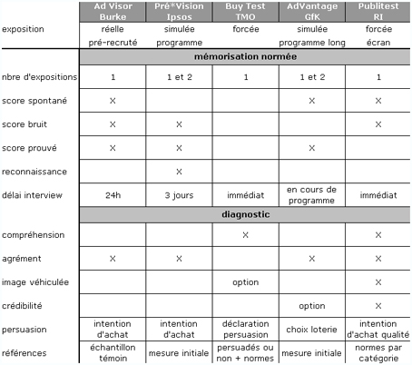 Créés au début des années 80 en France par Ipsos, les post-tests constituent encore la référence du marché. Depuis, les annonceurs se sont appropriés les scores Ipsos, pouvant comparer leurs campagnes dans le temps à la concurrence grâce à la banque de données Callipsos qui réunit plusieurs années de mémoire publicitaire aux standards Ipsos (le journal professionnel Stratégies s'en fait l'écho chaque semaine). Toujours leader sur ce marché de post-tests, Ipsos est de plus en plus concurrencé par d'autres produits normés. Citons :