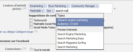 Dans notre exemple, vous voyez que les intérêts “Emarketing, Buzz marketing, community manager, mashable et seo” ont déjà été sélectionnés. En tapant le début de “search marketing” vous voyez apparaître les intérêts associés ainsi que la thématique Search engine marketing (les thématiques sont précédées d’un #).