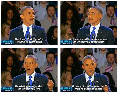 Consécration linguistique pour le GIF (Graphics Interchange Format), type de fichier d’image ou d’animation élu, en ce mois de novembre 2012, « mot de l’année » par le dictionnaire américain Oxford. Un temps considéré comme vestige honteux de la préhistoire d’Internet, il est revenu en grâce via les forums, la culture « LOL » et les mèmes, jusqu’à devenir un des formats les plus en vogue sur la toile. Autre consécration, son omniprésence, avec plus largement toutes les formes d’images, sur le tumblr de campagne de Barack Obama, à qui revient sans doute le privilège d’avoir introduit le mur de GIF en politique.