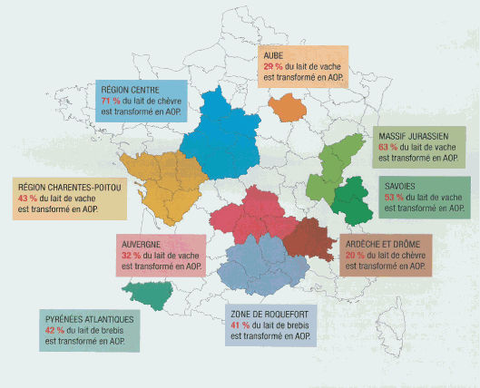 Ainsi, dans le massif du Jura, 63 % du lait de vache produit localement est transformé en AOP, et dans les départements de Savoie, ce taux avoisine les 53 %. L’activité économique de ces zones est donc intrinsèquement liée à la production sous AOP même si la valorisation de 100 % du lait produit est évidemment nécessaire pour les opérateurs.
