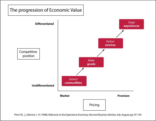En 1999 dans The Experience Economy, work is theatre and and every business a stage, Pine et Gilmore annoncent une nouvelle ère : l’économie de l’expérience. Après avoir mis en avant les matières premières, les produits manufacturés et les services, ils décrivent l’économie de l’expérience comme la prochaine étape permettant d’ajouter une réelle valeur ajoutée aux organisations. (Source)