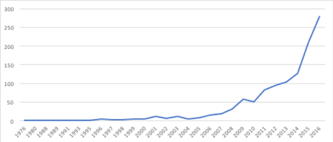 Évolution du nombre d’articles scientifique sur le thème de la pensée design.