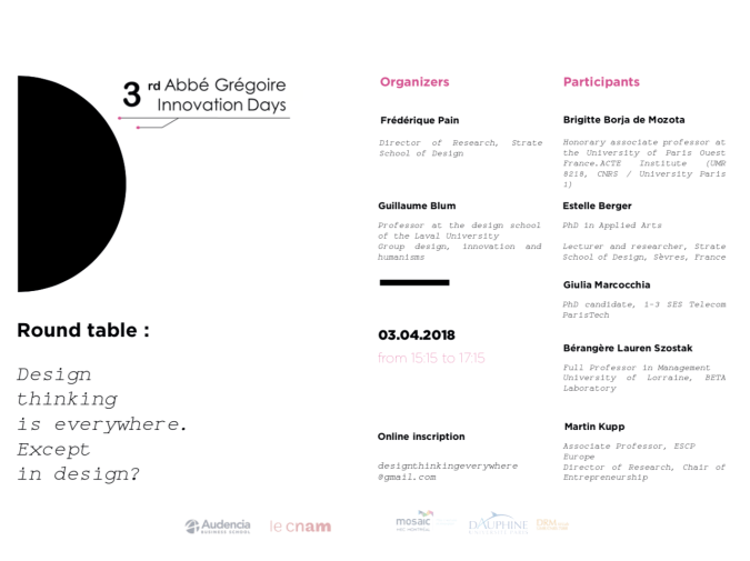 Vous êtes convié mardi 3 avril de 15h15 à 17h15 à une table ronde sur le thème Le design thinking est-il partout, sauf en design ? dans le cadre des journées de l’innovation de l’Abbé Grégoire, organisée au conservatoire des arts et métiers à Paris. Vous pouvez vous inscrire en envoyant un courriel à l’adresse suivante: