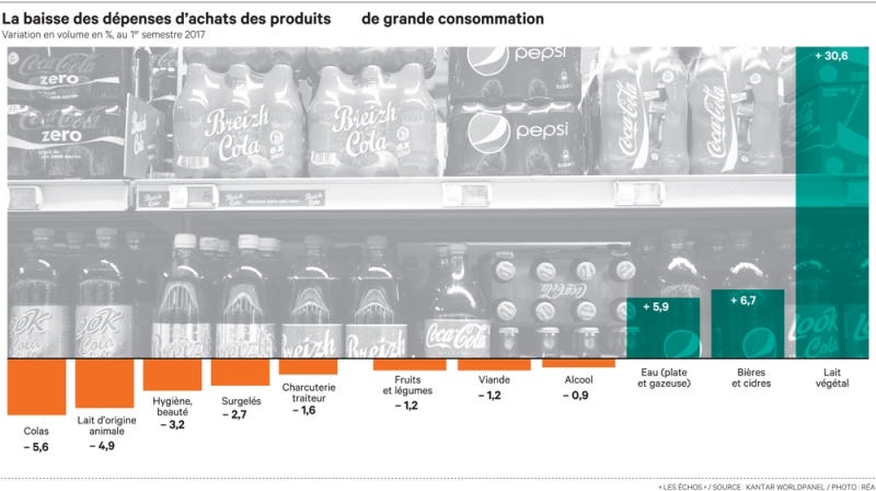 « Nous le constatons tous les jours : nos clients achètent moins mais plus de qualité. » Ce témoignage dans Les Échos de Thierry Cotillard, patron d’Intermarché, résume l’évolution de la consommation en France. Ainsi, selon Kantar Worldpanel, les volumes de produits de grande consommation achetés baissent. Et certains chiffres sont éloquents : sur le premier trimestre 2017, les ventes de produits d’hygiène et de beauté reculent de 3,2 %, celles des colas chutent de 5,6 %. Ce n’est pas uniquement une question de pouvoir d’achat, car dans le même temps, les achats progressent en valeur. Autrement dit, les Français consomment moins mais mieux.