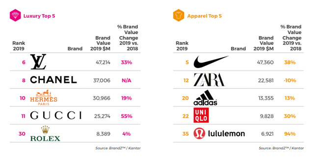 L’enseigne espagnole Zara occupe le 12e rang et a donc perdu deux places, mais sa valeur a surtout baissé de 10 %, pour atteindre 22,6 milliards de dollars ; quand le suédois H&M perd lui jusqu’à 39 % de sa valeur (à 6,4 milliards de dollars en 2019) et recule de 15 places pour atterrir au 37e rang. Ces chaînes de fast fashion « ont été impactées par la préoccupation croissante des consommateurs à propos des coûts de production, de transport et de la vente de produits jetables », commente Kantar.