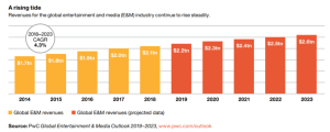 Comment se consommeront les médias et les loisirs dans cinq ans, quels secteurs porteront la croissance et à l’inverse ceux qui seront bientôt dépassés ? À l’horizon 2023, le marché des médias et de l’entertainement pèsera 2 600 milliards de dollars au niveau mondial d’après le cabinet PwC, contre 2 1000 milliards en 2018. Sa croissance annuelle est estimée à 4,3% en moyenne entre 2018 et 2023.