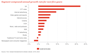 Actuellement, Facebook et Google captent l’essentiel des revenus publicitaires, les casques VR grand public sont accessibles, mais encore peu diffusés, les plateformes VoD se multiplient et l’e-sport n’est plus seulement un phénomène de niche, mais une véritable machine à cash investie par les annonceurs. Autant de facteurs qui expliquent que la VR, la vidéo OTT (les offres de vidéo hors opérateur, avec abonnement comme Netflix – SVOD – ou par transaction comme iTunes – TVOD – ou bien financée par la publicité comme YouTube – AVOD), la publicité digitale et l’e-sport porteront la croissance du marché mondial des médias et des loisirs dans les 5 ans à venir, réalité virtuelle en tête. D’après PwC, le podcast et l’e-sport affichent même des prévisions de croissance de revenus respectives de +28,5% et +18,3%. À l’inverse, les médias historiques sont à la peine : les journaux et magazines, ainsi que la télévision traditionnelle présentent des perspectives de croissance négatives.
