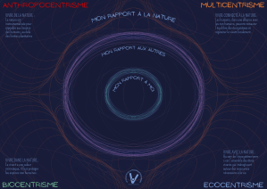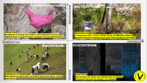 4 « relations humains – non humains » forment la trame des nouveaux imaginaires de l’écologie : les humains comme individus exploitant la nature pour les anthropocentristes, la vie et l’ensemble des espèces menacées par les humains pour les biocentristes, la communauté biotique pour les écocentristes dont les humains font partie sans pour autant en être acteurs et les êtres vivants comme individus en interaction dans un lieu donné pour le multicentrisme.