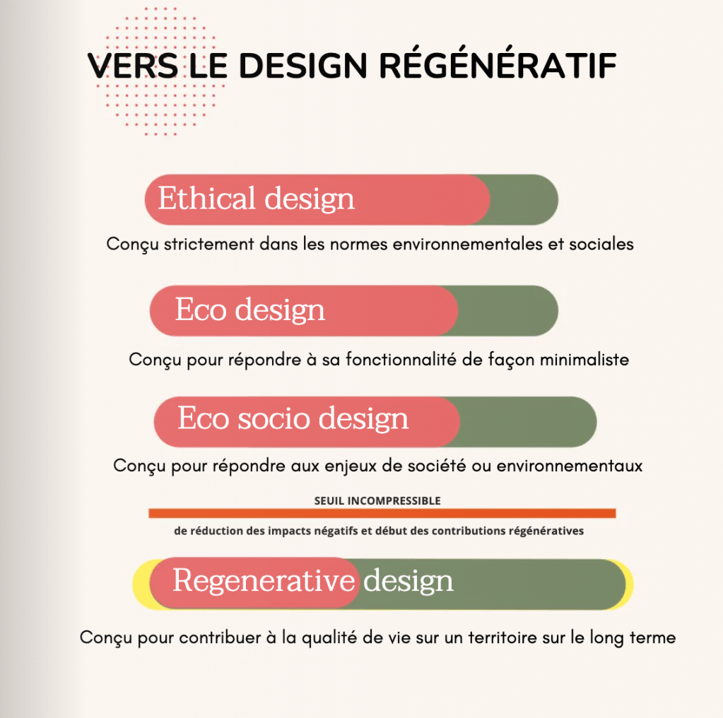 Cet objectif contributif challenge les processus d’éco conception actuels qui visent au mieux le net zero via la seule réduction des impacts négatifs et nécessite donc un nouvelle démarche de conception régénérative permettant de viser une prospérité partagée via la création de valeur ajoutée mutuellement bénéfique aux humains et non humains. Regenensis dans leur livre « Regenerative Development and Design » (Mang & Haggard) résument le Regenerative Development and Design (RDD) comme « une approche par les systèmes vivants et un ensemble de stratégies visant à améliorer la capacité des êtres vivants, en harmonisant les activités humaines avec l’évolution continue de la vie sur notre planète, alors même que nous continuons à développer notre potentiel en tant qu’êtres humains ». Ce qui est aligné avec notre approche de la régénération du vivant.