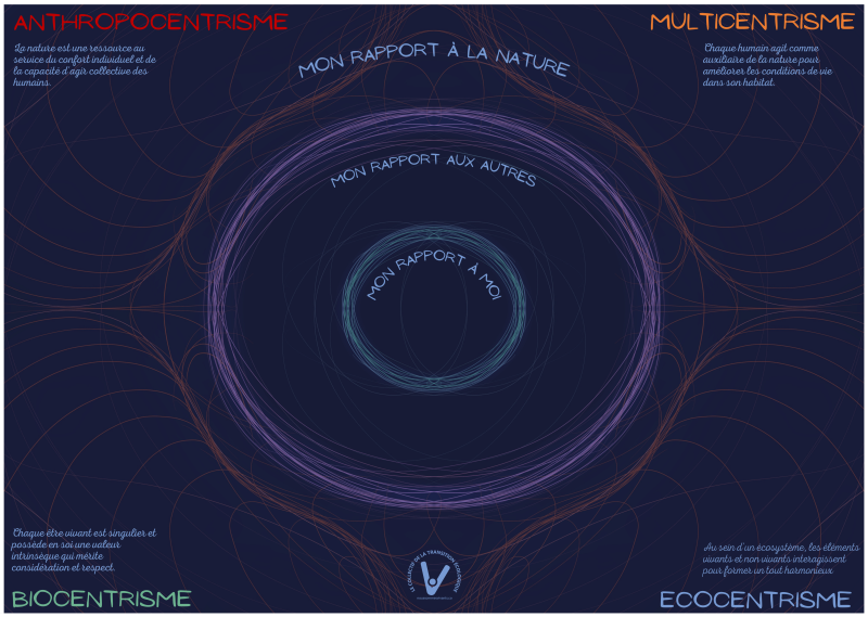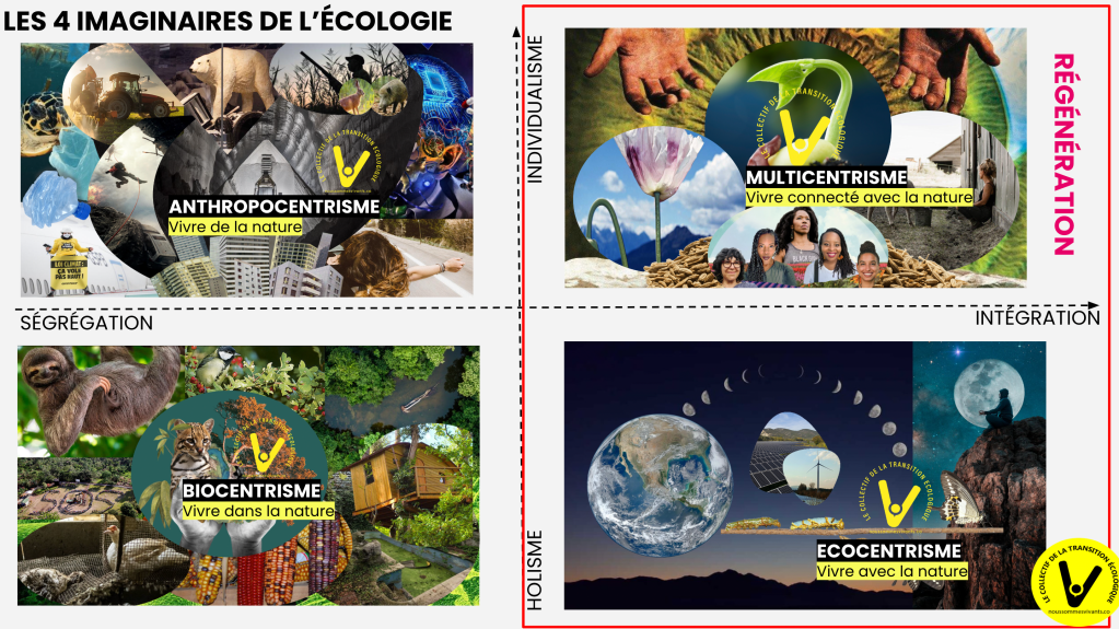 L’imaginaire multicentrique, aussi appelé pluricentrique pour souligner que chacun intègre le point de vue des autres dans la recherche d’un intérêt mutuel, est celui de la régénération. La régénération c’est prendre soin de soi, des autres et de la nature. Sans exclusion en intégrant tous les êtres vivants.