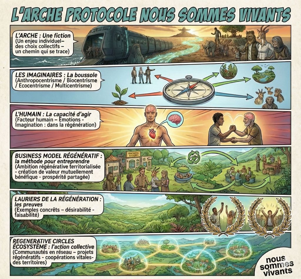 Mais L’Arche n’est pas une fiction détachée du réel. Derrière le récit se déploie un protocole de transformation, ancré dans une compréhension fine du vivant : systèmes complexes, relations, cycles longs, capacités de renouvellement.