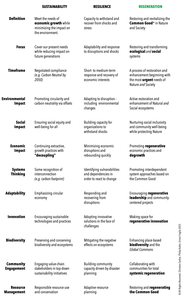 Le dernier article de Folke et al. (2025), précise la différence entre developpement durable (limiter et réduire), la résilience (restaurer) et la contribution active des humains (régénération).Sustainability, Resilience, Regeneration – What’s the Difference? June 4, 2023 by Christian Sarkar, Philip Kotler, and Enrico Foglia