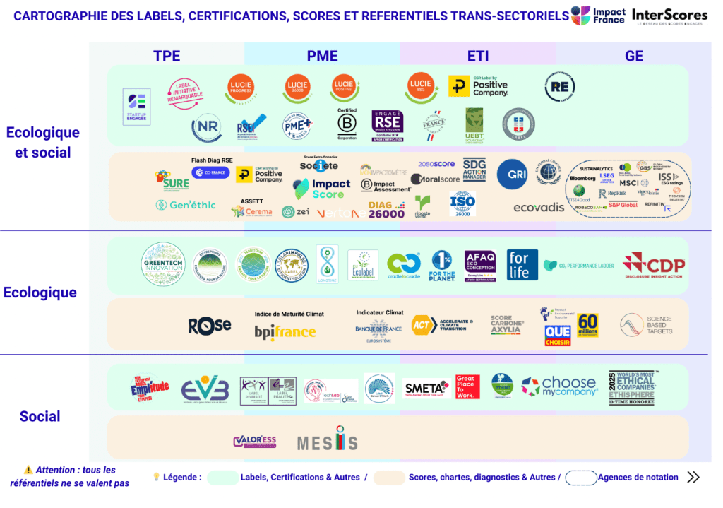 Impact France à réalisé la cartographie de tous les labels, certifications et scores RSE et d’impact qui peuvent correspondre à votre entreprise. Nous avons commencé à les positionner dans une trajectoire vers la régénération avec le Capacity Score : par secteurs (work in progress)
