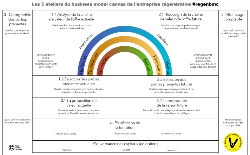 Le Business Model Canvas de l’Entreprise Régénérative permet de prendre la mesure de ses impacts au niveau de la chaîne de valeur d’un produit / service pour concevoir des offres de produits / services à impact avec un réseau de parties prenantes. Présention du RegenBMC