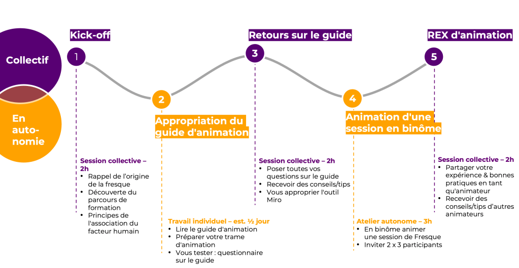 Cette formation permet à toute personne qui la suit de faciliter une fresque du Facteur Humain. La formation dure un mois et est constituée de 5 étapes.